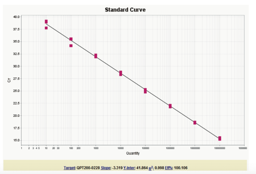 Prepare a dilution series with five or more dilutions of template DNA. Perform qPCR assay using the diluted DNA with the newly designed primers and probe, and draw a standard curve. Confirm that the PCR efficiency is between 90% and 110% and R2 is equal to or greater than 0.99. If the PCR efficiency or R2 are outside of these ranges, the reaction conditions should be optimized. If this does not improve the result, the primers and/or probe should be redesigned.