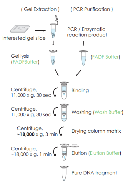 GEL/ PCR Purification Kit contains a silica-gel-membrane for binding of DNA in high-salt buffer (pH 4.5~5.5) and elution of DNA with low-salt buffer (pH 7.0~9.0) or ddH2O. The purification procedure removes primers, nucleotides, enzyme, salts, ethidium bromide and agarose impurities from DNA samples.