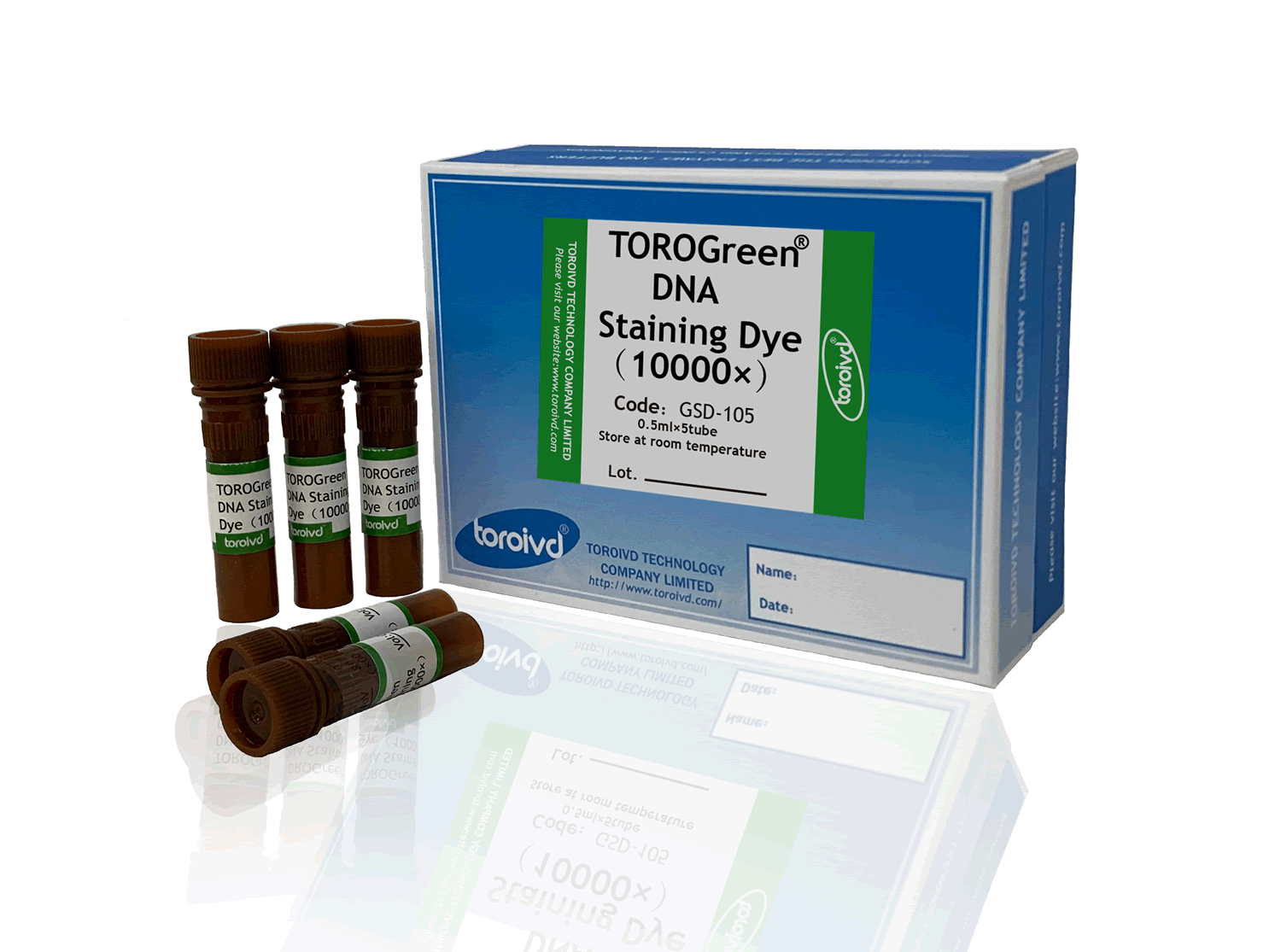 TOROGreen DNA Staining Dye (10000×) is designed to be a safer replacement for conventional EtBr which poses a significant health and safety hazard for its users. This dye is far more sensitive and stable than EB or SYBR series dye for staining dsDNA, ssDNA in agarose or polyacrylamide gels.This dye can be used to stain DNA in agarose gels via either precast or post gel staining, and in in polyacrylamide gels via post gel staining. TOROGreen DNA Staining Dye is compatible with a 470nm blue LED light transilluminator and imaging systems.