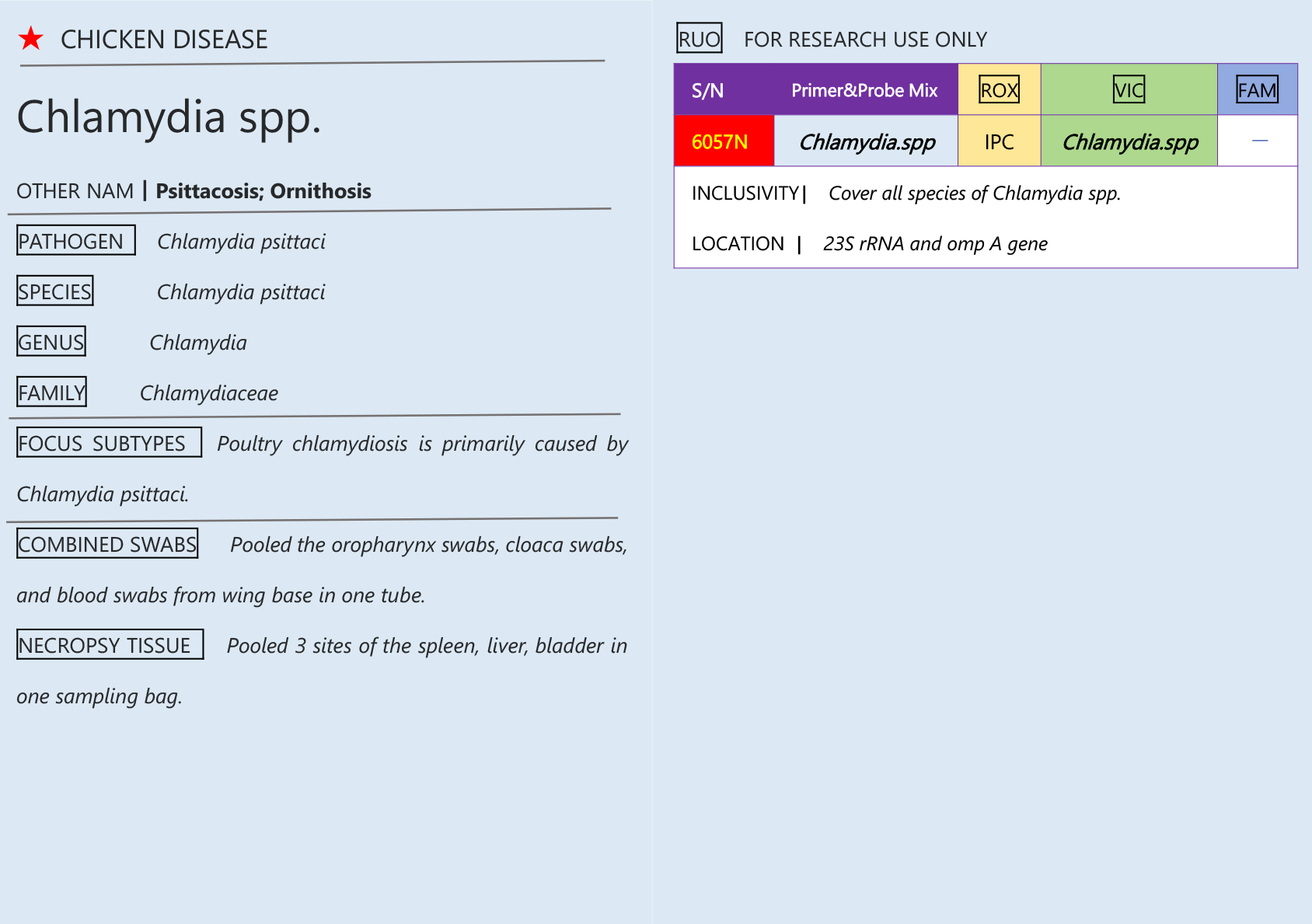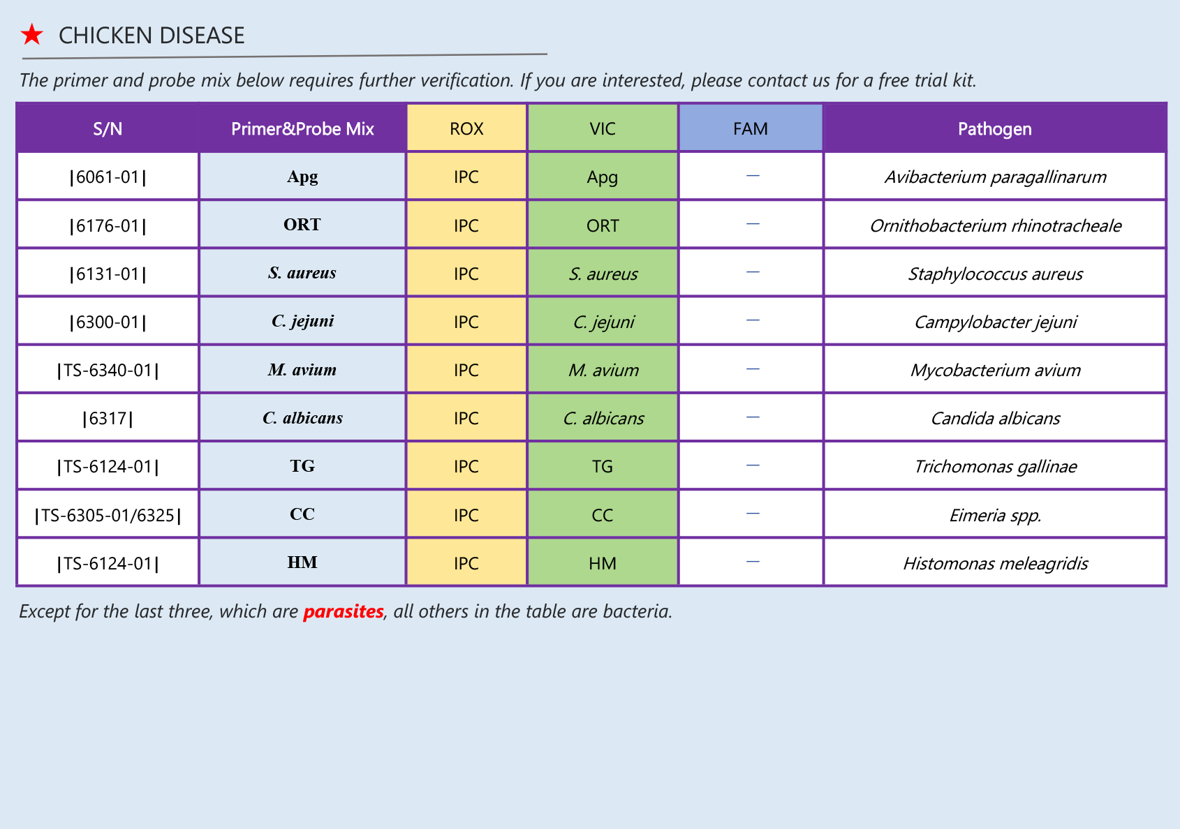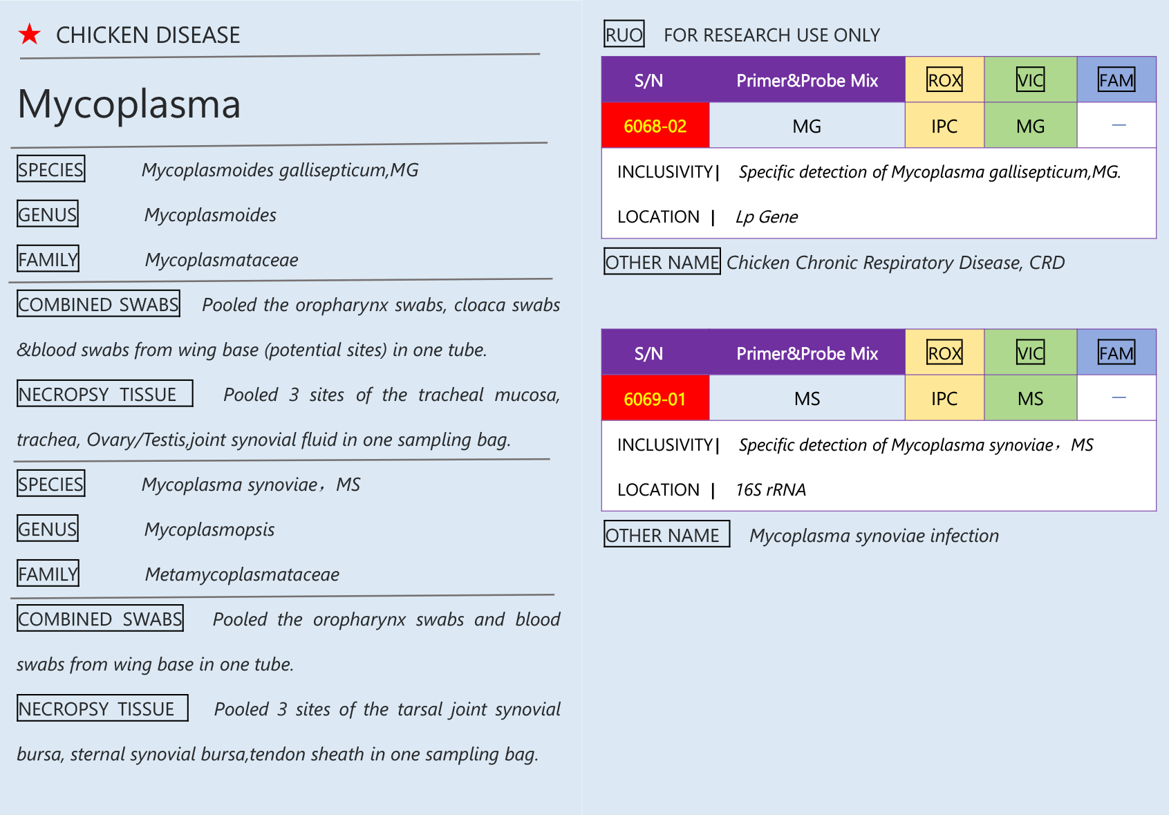 We offer the pre-mixed primer and probe mix for all bacterial diseases in chickens. 8 of these, including MS,MG,Chlamydia.spp,Salmonella spp. ,APEC,RA, C. perfringens,P. mulocida,all o have been extensively validated and proven to be highly effective.