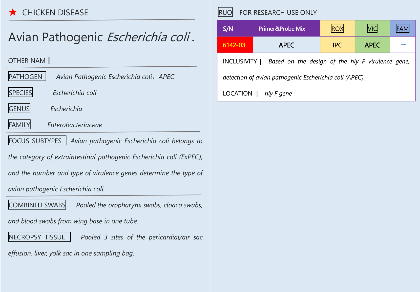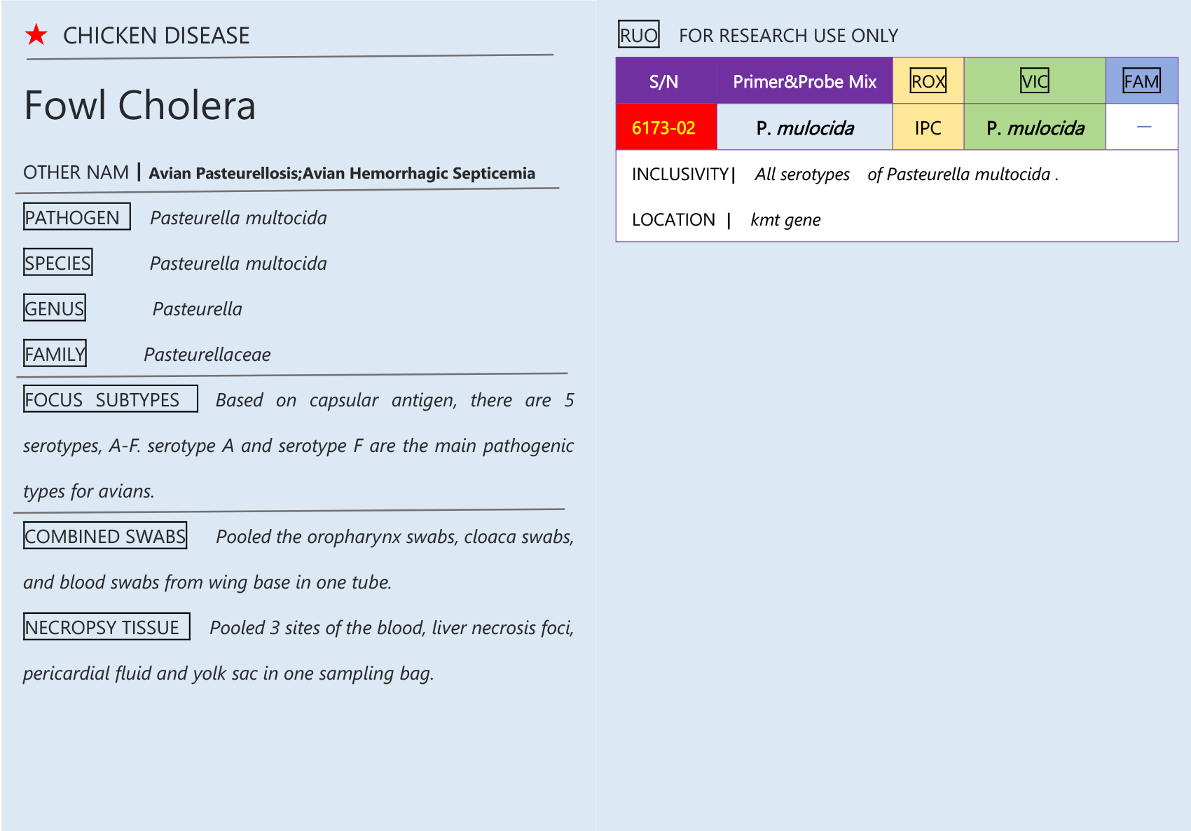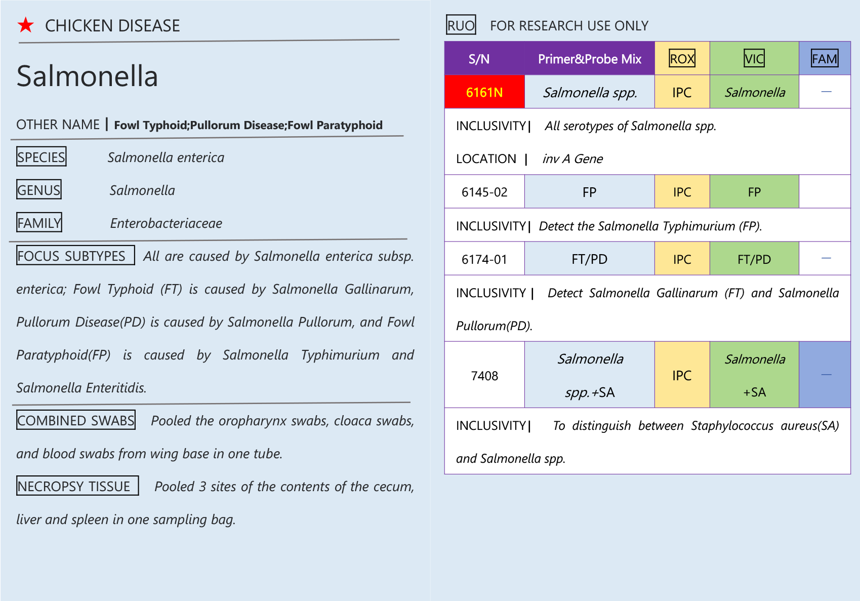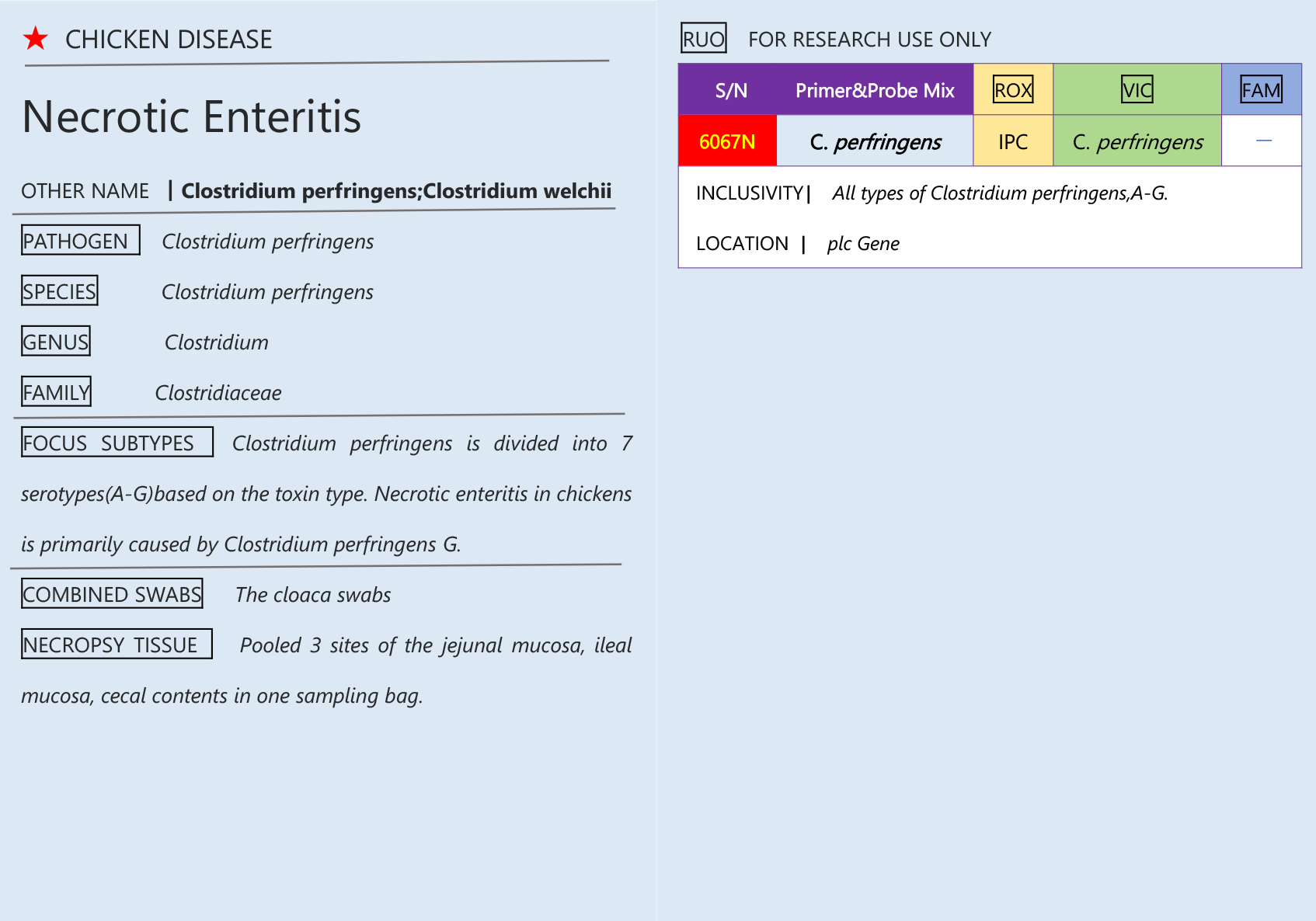 We offer the pre-mixed primer and probe mix for all bacterial diseases in chickens. 8 of these, including MS,MG,Chlamydia.spp,Salmonella spp. ,APEC,RA, C. perfringens,P. mulocida,all o have been extensively validated and proven to be highly effective.